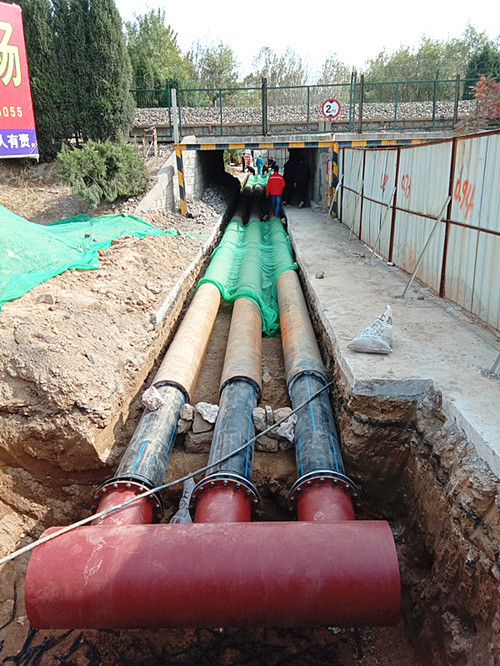 工程实施中,因其横穿铁路涵洞,事关京沪铁路禹城段的正常运行,经与铁路部门多次协调和设计单位多次勘察,针对铁路涵洞基础浅、地下通讯光缆、电缆等线路较多的实际问题,多次调整穿越涵洞施工的设计方案,最终采用三条Ф400mmPE管外加DN500钢套管施工,以确保向城区输水的流速与流量。