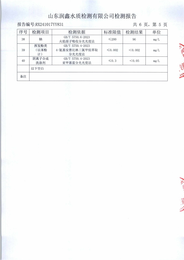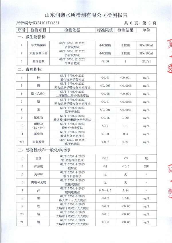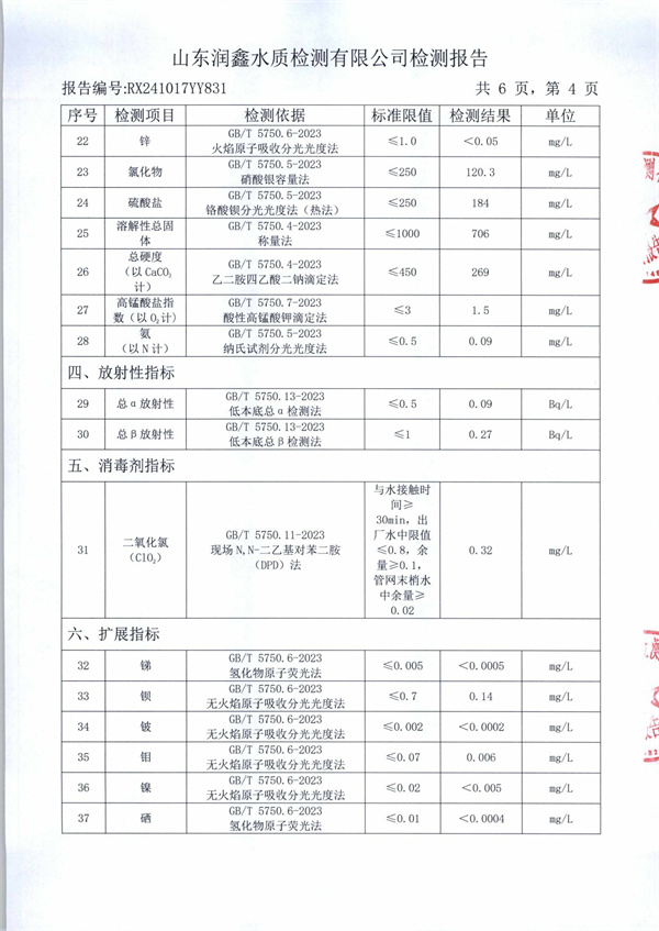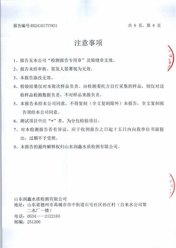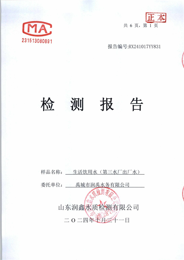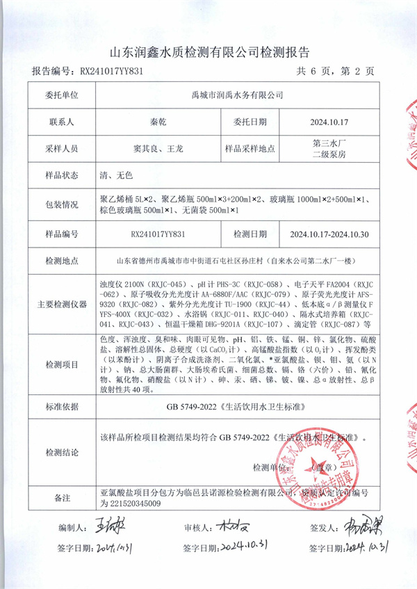 禹城市润禹水务有限公司2024年10月出厂水月检水质公告