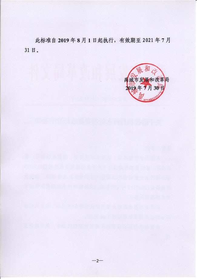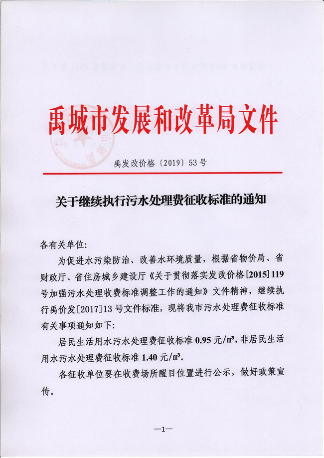 关于继续执行污水处理费征收标准的通知(禹发改价格【2019】53号)