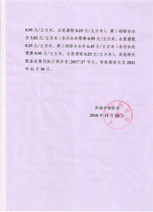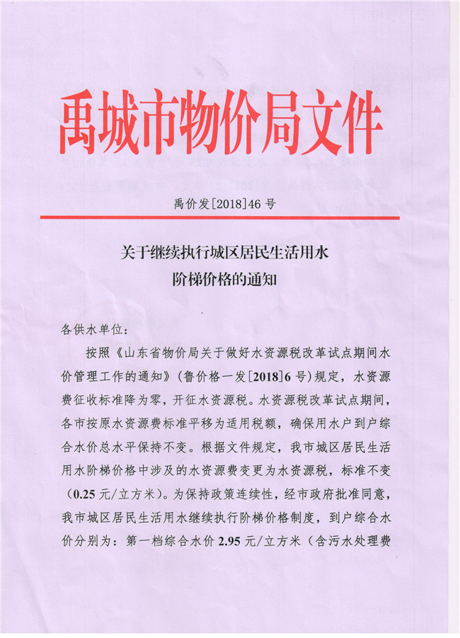 关于继续执行城区居民生活用水阶梯价格的通知(禹价发【2018】46号)