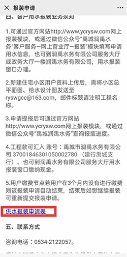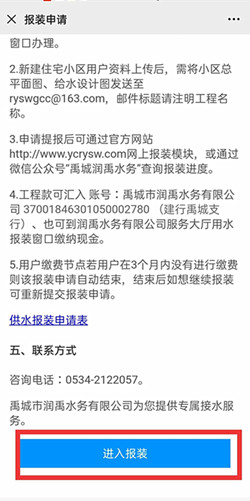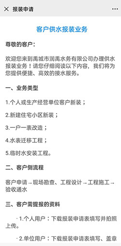 三、进入客户报装服务指南阅读相关内容、下载填写《供水报装申请表》、点击进入报装。