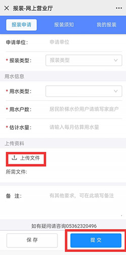 四、填写报装信息点击上传文件,点击提交,完成报装。