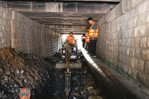 两处穿越涵洞施工,以人民路南首穿越铁路涵洞供水管网施工最为困难,是全市供水管网长远布局的攻坚环节,打通自第二水厂经石凤街DN600输配水主管网与人民路、南环路、市中路、通衢路、迎宾路等路段主管网,并连接至北外环与第三水厂输配水主管网形成环网,使城区供水更加稳定、压力更加均衡。
