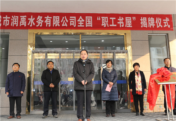 仪式上,德州市总工会代表中华全国总工会向禹城市润禹水务有限公司赠送了价值3万余元800余册的图书,并由德州市总工会党组成员、副调研员刘俊勇和润禹水务有限公司董事长、总经理魏永生为全国职工书屋示范点揭牌。