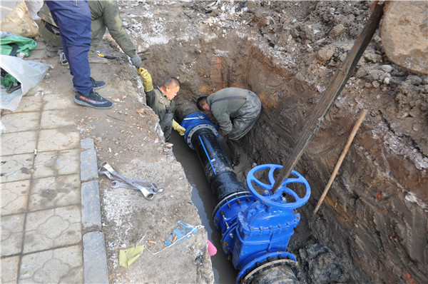 此次管道改造工程,虽然工程量大、工期紧、天气寒、环境恶劣,但依旧阻挡不了同志们工作的热情。为了缩短停水时间,我公司投入大量人工、机械。白天由于市中路人流较大,为了减少对过路行人的通行阻碍,同志们经常晚上加班至深夜,仅耗时15天便完成了近1000米的管道更换。