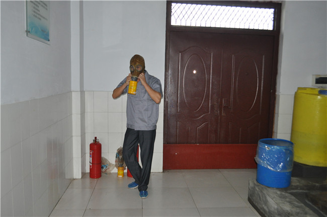 演练中,值班人员接到模拟漏氯仪报警后立即切断设备电源、开启门窗,并电话报告给上级领导;水厂马上根据风向,疏散人群,设置隔离带;制水人员立即戴好空气呼吸器,进入加氯车间进行处理,解除危机;最后工作人员做好记录,针对相关问题提出改进措施。