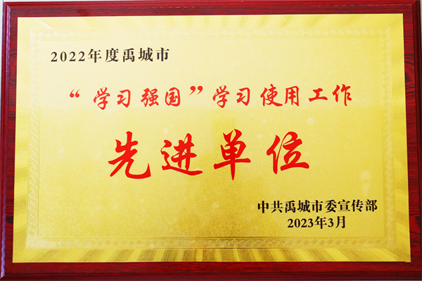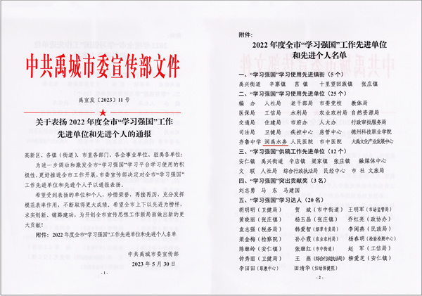 公司荣获禹城市“学习强国”学习使用工作先进单位荣誉称号