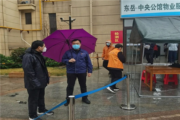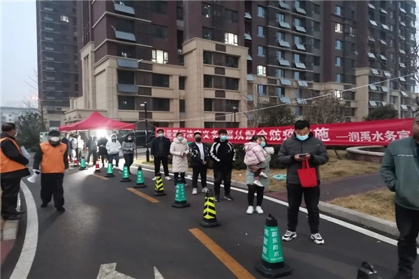 共驻共建小区中央公馆和润禹水务两个家属院小区共761户住户,人口众多,检测任务艰巨。12日清晨,公司人员便分头行动,安排布置检测现场,购置运送相关物资,划定体温检测、出口、入口、等候、登记、采样、隔离等功能区域,同时安排人员分组逐楼逐户通知,核实人员信息,解释相关问题,帮助扫码提前预约。期间,天空下起了雨,工作人员冒雨奔走在小区内,淋湿了衣衫,冻僵了双手,却浑然不觉,只为争分夺秒尽快完成全员核酸检测任务,确保不漏一户,不漏一人。