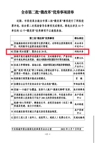 润禹水务“用水前置”“微改革”事项获全市通报表扬